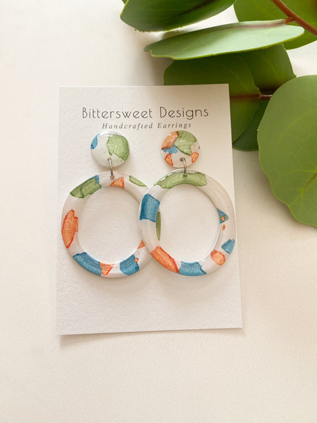 Torn lime green, orange, and blue sparkle clay set on a speckled ivory base.