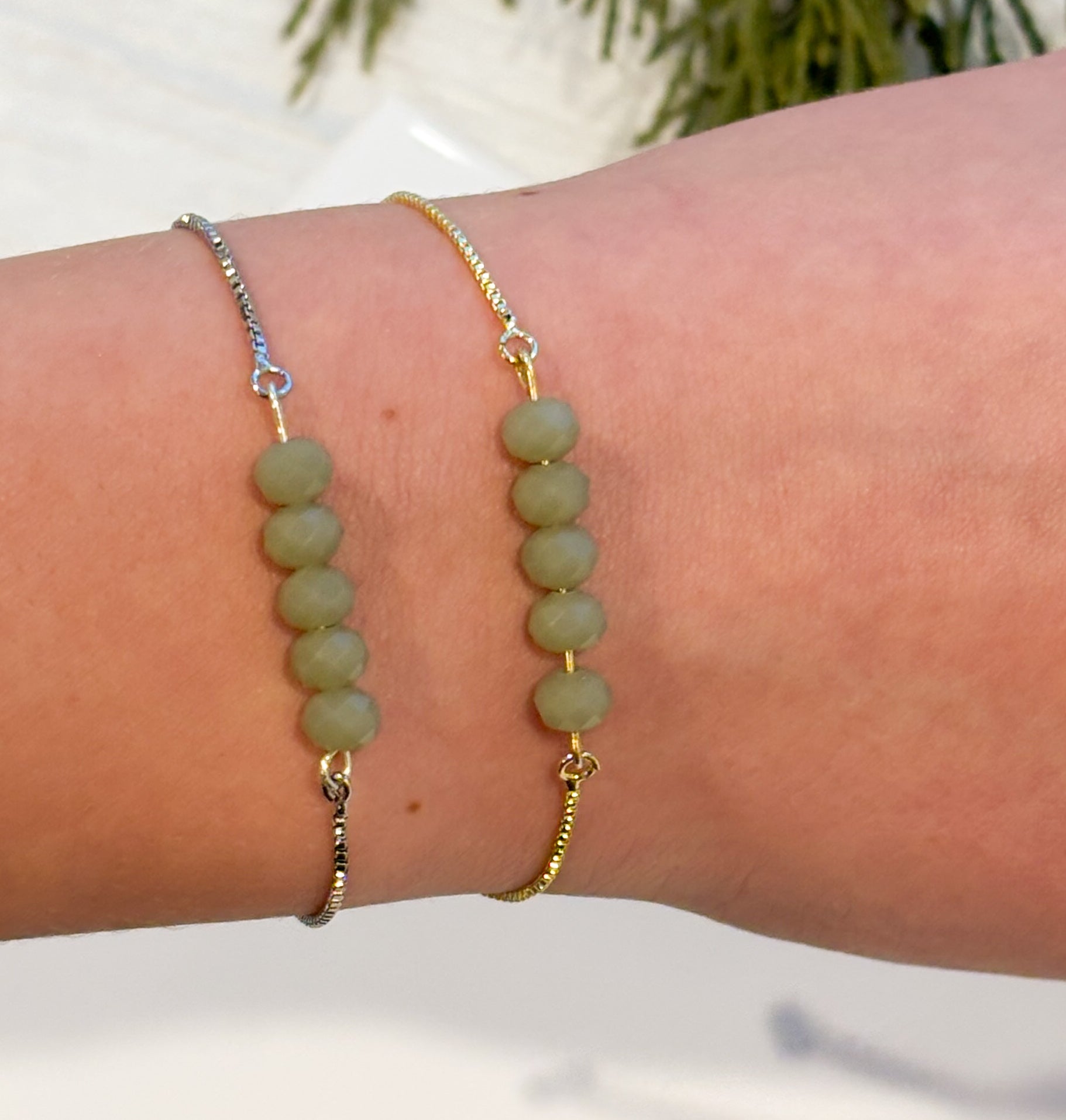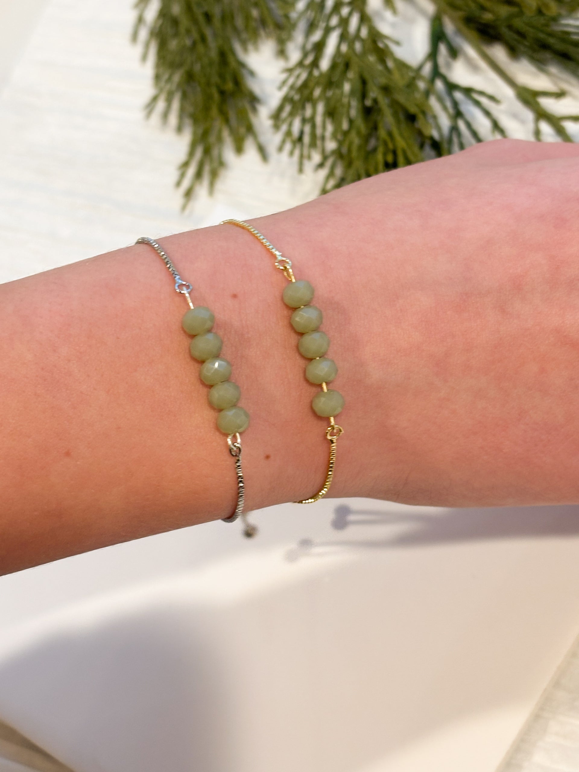 Return to shopMoss green faceted crystal beads on an adjustable chain.