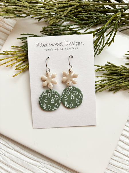 Green shimmery clay with white painted trees paired with a shimmery ivory snowflake.