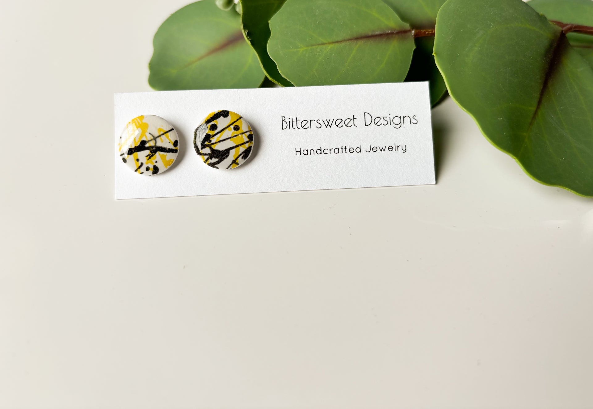 White clay with black and yellow splatter print.
