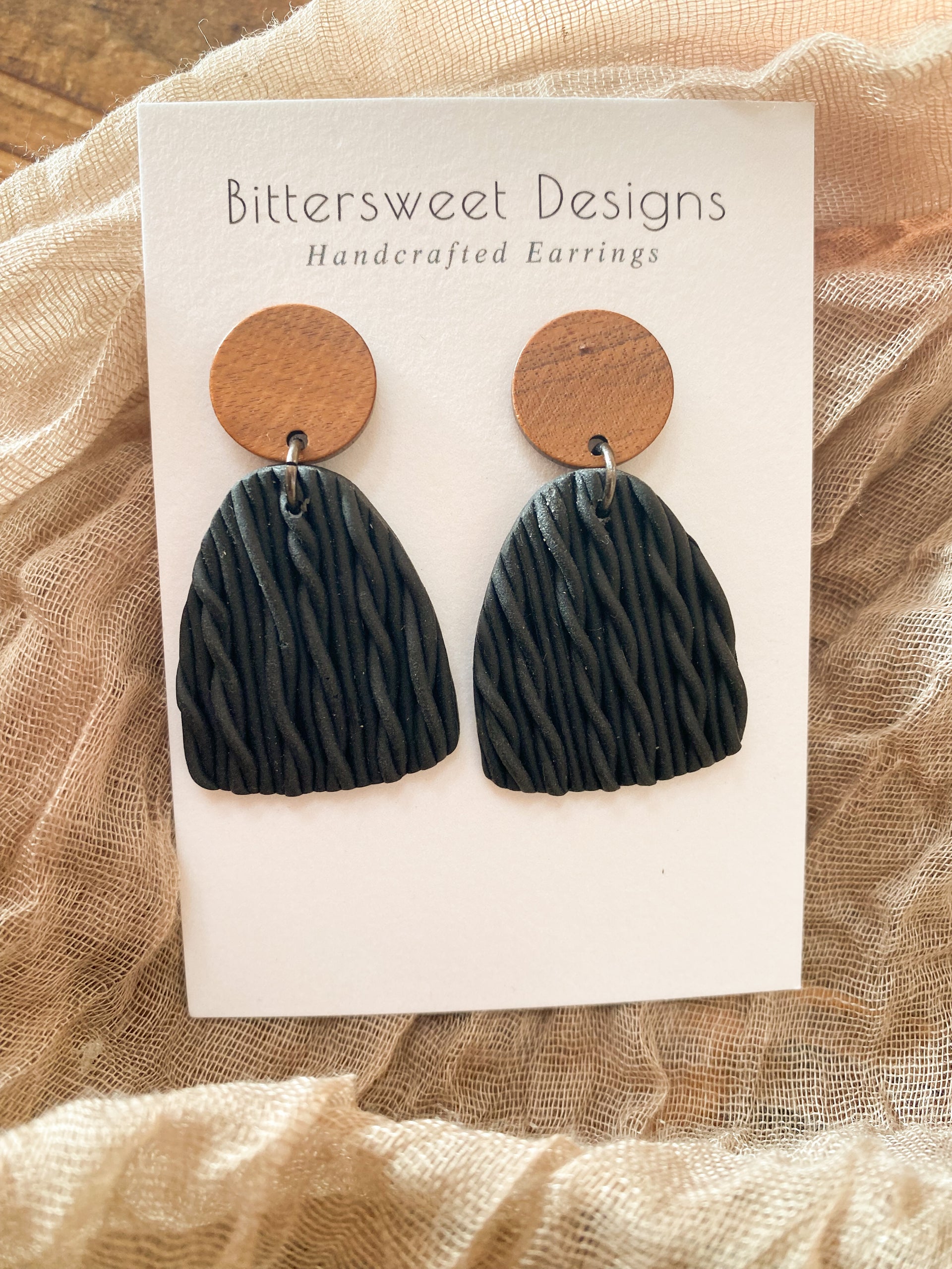 Return to shopStatement dangle! Black braided clay with wood nickel free topper.