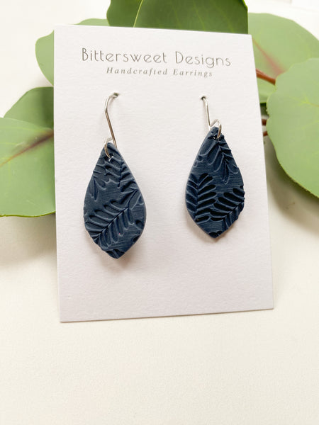 Return to shopNavy blue clay with a fern texture on a french hook.
