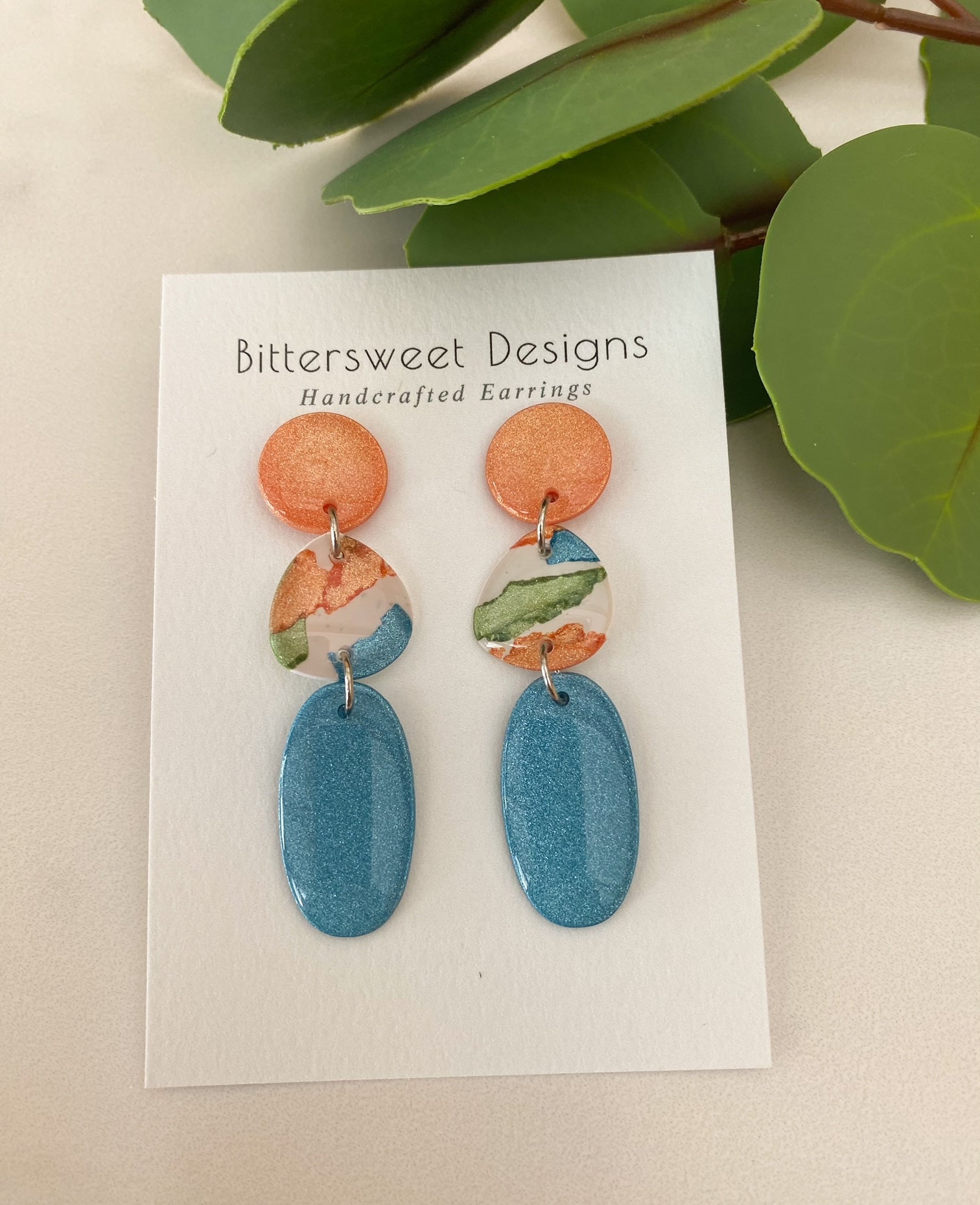 Torn blue, lime green, and orange abstract triangle set on speckled ivory clay